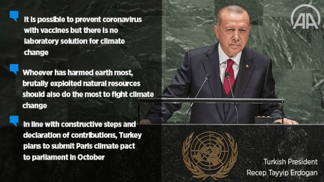 Turkey plans to submit Paris climate pact to parliament in October, Turkish President Erdogan told UN General Assembly.
