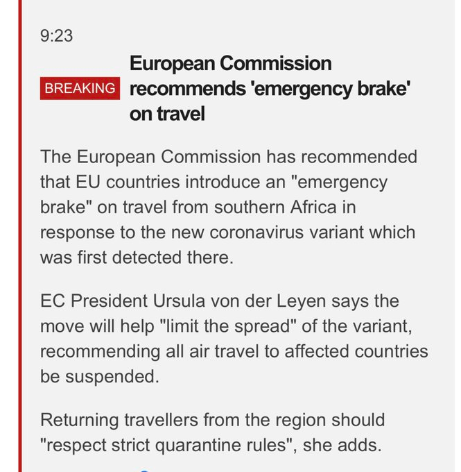 Eric Feigl-Ding @DrEricDing · BREAKING— The European Commission has recommended that EU countries introduce an “emergency brake” on travel from southern Africa due to #B11529… to help “limit the spread”, recommending all air travel to affected countries be suspended & “respect strict quarantine rules”.