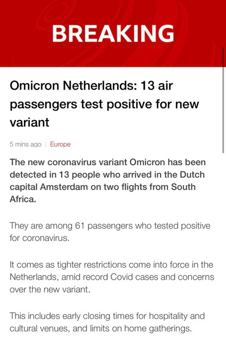 13 #Omicron variant cases now confirmed from 61 #COVID19 cases among ~600 passengers on two flights from South Africa to Amsterdam (that took off and was mid-air when EU travel limits added). Dutch government warns there will likely be more. https://bbc.co.uk/news/world-europe-59451103 Show this thread
