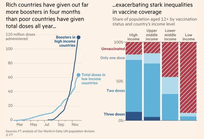 Omicron: Have the rich countries been too Greedy? Recommend following Eric Topol on Twitter. “Rich countries have given out far more boosters in 4 months than poor countries have given total doses all year… Do not be foolish and say we did not know. We were warned by Dr Tedros, Dr Mike Ryan and so many others. Omicron is the virus, the pathogen fighting its corner to survive. Stark message in this diagram … look at low income … it is a shocking indictment.