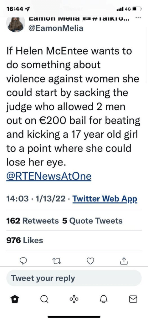 15 Jan, 2022 Uncategorized Too many Assaults, some Judges are Detached from Reality, Pain and Suffering??? As for McEntee, she is out of her Depth?? Posted by Fred Bassett Share this: Share on X (Opens in new window) X Share on Facebook (Opens in new window) Facebook Share on LinkedIn (Opens in new window) LinkedIn Share on Reddit (Opens in new window) Reddit Email a link to a friend (Opens in new window) Email More Print (Opens in new window) Print Like Loading... Related