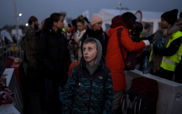 Ukrainian refugees at the border crossing between Poland and Ukraine, at Medyka, Poland, on March 15, 2022. (Carrie Keller-Lynn/The Times of Israel)