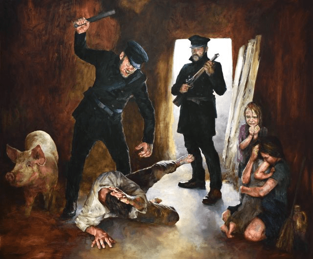 An incredible painting of an Irish eviction I comissioned, by Danny Howes. It is estimated that, excluding peaceable surrenders, well over a quarter of a million people were evicted between 1845 and 1854. Taken from the book ‘The Truth Behind The Irish Famine’. 72 paintings and 472 eyewitness quotes. www.jerrymulvihill.com
