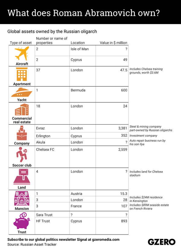 Of all the Russian oligarchs facing Western sanctions over the Kremlin’s invasion of Ukraine, one name stands out: Roman Abramovich. The owner of Chelsea FC soccer club used to be one of the world’s richest men, but recently he’s seen his net worth slashed by almost a third to about $8 billion and had most of his assets frozen. We take a look at all the nice things Abramovich has — but can’t touch while sanctions remain in place.
