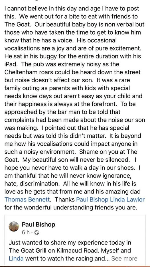 25 Mar, 2022 Uncategorized This is most Disturbing to Read? If these Allegations are true, it is most disturbing that a Child with special needs, and his Parents were asked to leave?? Why is Ireland, becoming so Hostile of late??? Who was the Barman??? Posted by Fred Bassett Share this: Click to share on X (Opens in new window) X Click to share on Facebook (Opens in new window) Facebook Click to share on LinkedIn (Opens in new window) LinkedIn Click to share on Reddit (Opens in new window) Reddit Click to email a link to a friend (Opens in new window) Email More Click to print (Opens in new window) Print Like Loading... Related