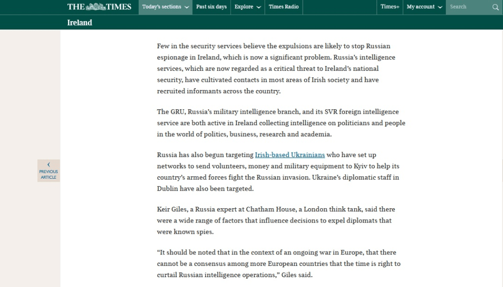 London HQ’d Times Ireland has a predictable and hilarious report on the expulsion of Russian diplomats yesterday. Apparently, Russia is recruiting informants right across the country now. No word on remuneration but if you see any strange delivery of barrels of oil, contact G2.