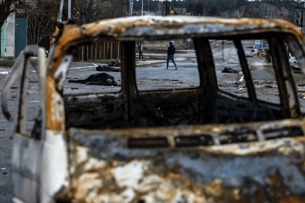 Bucha (Ukraine) (AFP) – The bodies are strewn across the quiet tree-lined street in the town of Bucha as far as the eye can see.