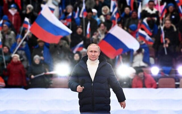 Russian President Vladimir Putin attends a concert marking the eighth anniversary of Russia’s annexation of Crimea at the Luzhniki stadium in Moscow on March 18, 2022. (Sergei GUNEYEV / POOL / AFP)