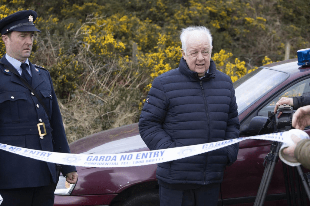 Jim Sheridan, centre, during filming for Murder At The Cottage. Photograph by Barbara McCarthy © Sky UK 2021