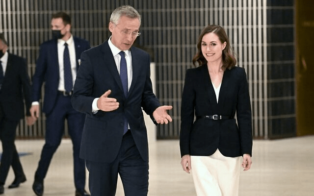 In this photo from October 25, 2021, NATO Secretary-General Jens Stoltenberg (L) meets with Finland’s Prime Minister Sanna Marin during the The North Atlantic Council’s (NAC) visit in Helsinki. (Jussi Nukari/Lehtikuva/AFP)
