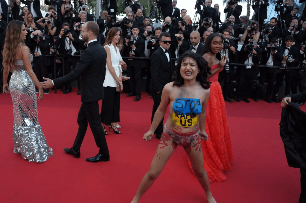 Russia’s war in Ukraine was once again in the spotlight at the Cannes Film Festival on Friday as an unidentified woman stormed a red carpet premiere, stripping off her clothes to reveal the words “Stop raping us” written across her torso, next to the blue and yellow colours of the Ukraine flag. It was the latest in a string of references to the plight of a war-torn country whose president opened the festival earlier this week with an emotional appeal to the power of cinema.