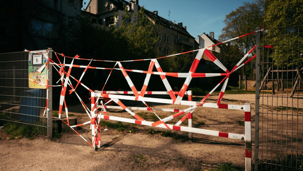 Tape blocks access to a playground in Germany in April 2020. Foto: Dominik Asbach / laif