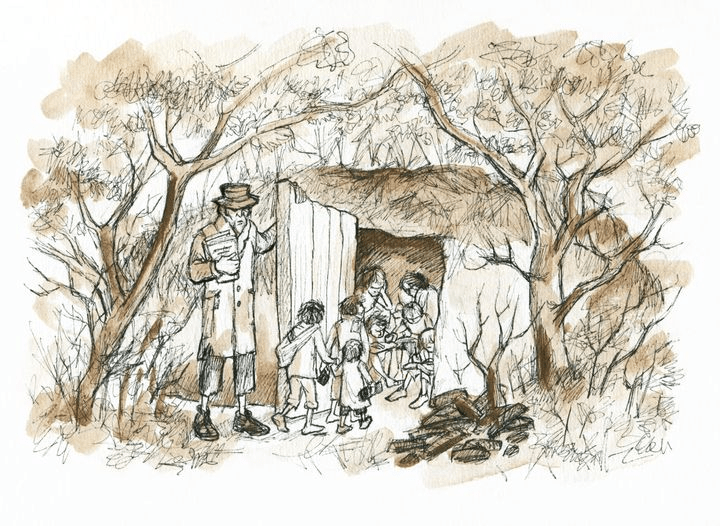 A Hedge school pre-famine, during the Penal Laws when it was illegal for Catholics to receive an education. “The children were educated in a secret location, one child always kept lookout each time from soldiers. The little schoolchildren sat wrapped as well as possible in their tatters on the ground. Each child had brought a piece of turf with him as tribute and fee for the teacher.” From The Truth Behind The Irish Famine. 72 images, 472 eyewitness quotes: www.jerrymulvihill.com