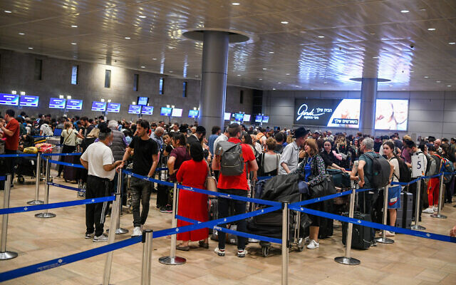 Travelers wait in line in the departures hall at Ben Gurion Airport on May 30, 2022. (Arie Leib Abrams/Flash90)