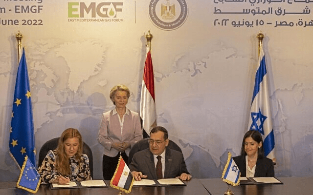 European Commission President Ursula von der Leyen (back) looks on as EU Commissioner for Energy Kadri Simson (L), Egyptian Minister of Petroleum Tarek el-Molla (C), and Israeli Minister of Energy Karine Elharrar (R) sign a trilateral natural gas deal at the ministerial meeting of the East Mediterranean Gas Forum (EMGF) in Cairo on June 15, 2022. The deal provides for the export of Israeli natural gas, via Egypt, to Europe. (Khaled DESOUKI / AFP)