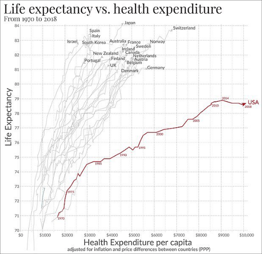 for the last 40 years of healthcare and life expectancy, the united states —- alone among advanced democracies — has been on the wrong tract