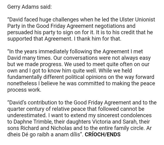 26 Jul, 2022 Uncategorized Lord Trimble who supported the Good Friday Agreement RIP. Tribute from Gerry Adams, Sinn Fein. Posted by Fred Bassett Gerry Adams @GerryAdamsSF 6h Share this: Click to share on X (Opens in new window) X Click to share on Facebook (Opens in new window) Facebook Click to share on LinkedIn (Opens in new window) LinkedIn Click to share on Reddit (Opens in new window) Reddit Click to email a link to a friend (Opens in new window) Email More Click to print (Opens in new window) Print Like Loading... Related