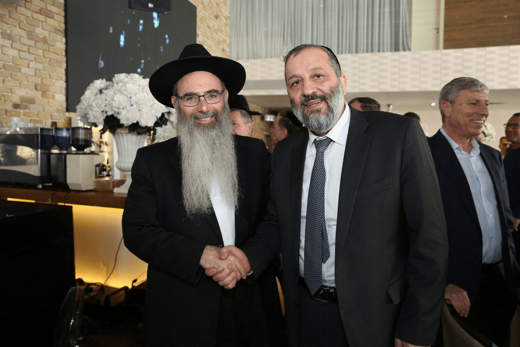 Rabbi Chaim Shlomo Diskin (L) meets with Aryeh Deri during his visit in Kiryat Ata on February 7, 2017 (Yaacov Cohen/Flash90)