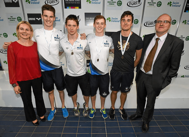 © Provided by Evoke.ieNAC swimmers, from left, Conor Sheahan, Matt Coward, Cillian Colvin and Brian O’Sullivan who were presented with their Men’s 400m freestyle relay national championships bronze medals by Swim Ireland CEO Sarah Keane and Paul McDermott, Irish Sports Council, Director of High Performance, NGB’s & Communications, during the 2015 Irish Open Swimming Championships at the National Aquatic Centre. Pic: Stephen McCarthy / SPORTSFILE