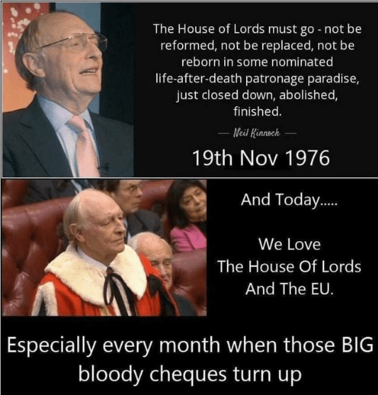 Pulled up by his bootstraps: once he represented the miners but he elevated his position to wealth and to being a Lord. A social “Climber”. Check out Neil Kinnock and you will be impressed by the wealth he accrued. Never forget the Brits are brilliant at bluffing the people; it goes on century after century. Look to all the “Lords and titles” post Good Friday Agreement.