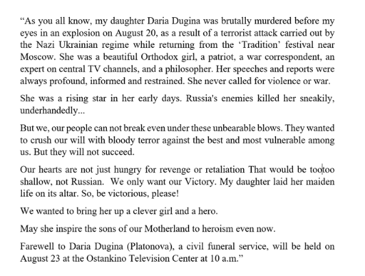 Statement by Alexander Dugin, published through Konstantin Malofeev: