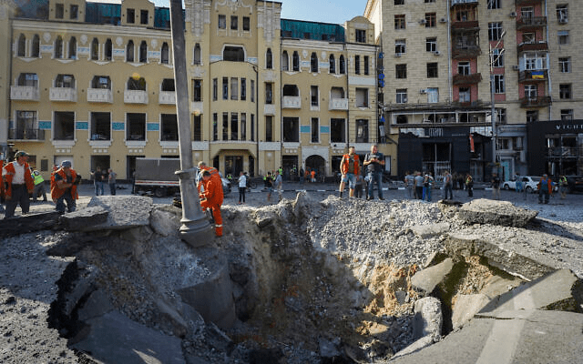 A view of a crater from a night Russian rocket attack, near to damaged buildings in downtown Kharkiv, Ukraine, Aug. 27, 2022. (AP/Andrii Marienko)