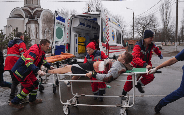 Ukrainian paramedic Serhiy Chornobryvets, second left, helps his colleagues carry a man injured during a shelling attack into a hospital in Mariupol, Ukraine, March 1, 2022. (AP/Evgeniy Maloletka)