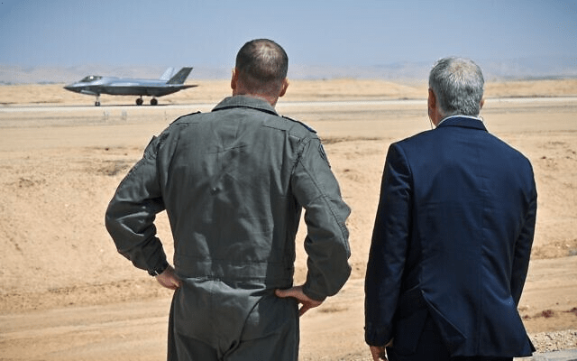 Prime Minister Yair Lapid (R) and Air Force commander Tomer Bar watch an F-35 at the Nevatim airbase in southern Israel, on September 6, 2022. (Kobi Gideon/PMO)