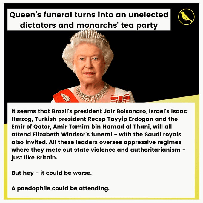14 Sep, 2022 Uncategorized The Canary and Fred adds in the coal mine. Honour Queen Elizabeth but has it become opulent orchestrated spledour that is grotesque. The importance of the word “Enough”. Posted by Fred Bassett Source: The Canary @TheCanary Thank goodness for small mercies, eh? By @MrTopple Share this: Click to share on X (Opens in new window) X Click to share on Facebook (Opens in new window) Facebook Click to share on LinkedIn (Opens in new window) LinkedIn Click to share on Reddit (Opens in new window) Reddit Click to email a link to a friend (Opens in new window) Email More Click to print (Opens in new window) Print Like Loading... Related