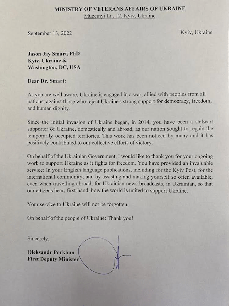 Ukraine behaves as one expects a sovereign country; Russian Federation pretend to have a special military operation so that they can take over Ukraine and rebuild the Soviet Empire. Well done Jason Jay Smart and well deserved recognition from Ministry of Veterans Affairs of Ukraine. Keep people in the loop of knowledge at every level possible.