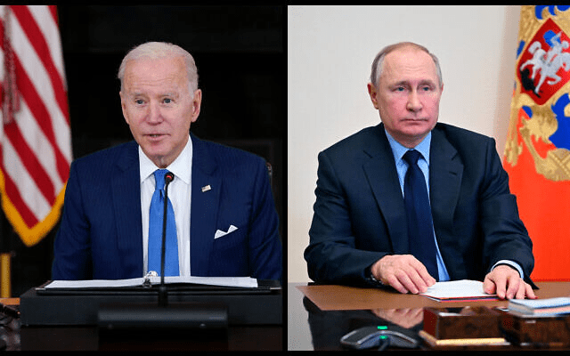 President Joe Biden speaks in the State Dining Room of the White House, February 9, 2022, in Washington; Russian President Vladimir Putin chairs a Security Council meeting via videoconference at the Novo-Ogaryovo residence outside Moscow, Russia, February 11, 2022. ( (AP Photo/Patrick Semansky; Alexei Nikolsky, Sputnik, Kremlin Pool Photo via AP)