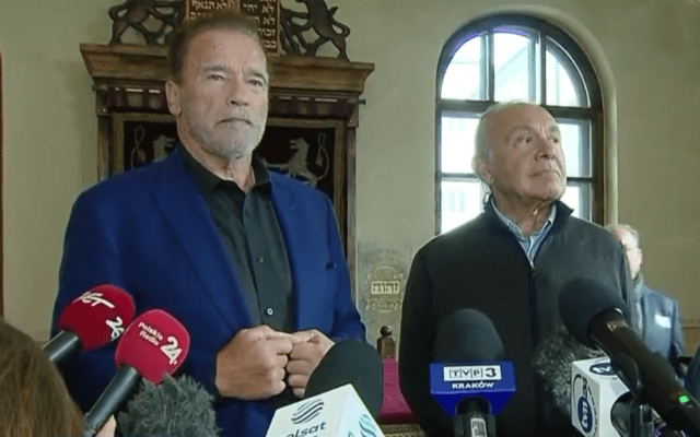 Former California governor and film icon Arnold Schwarzenegger addresses the media at the Auschwitz Jewish Center Foundation during his visit to the Auschwitz Nazi death camp, September 28, 2022. (Twitter)