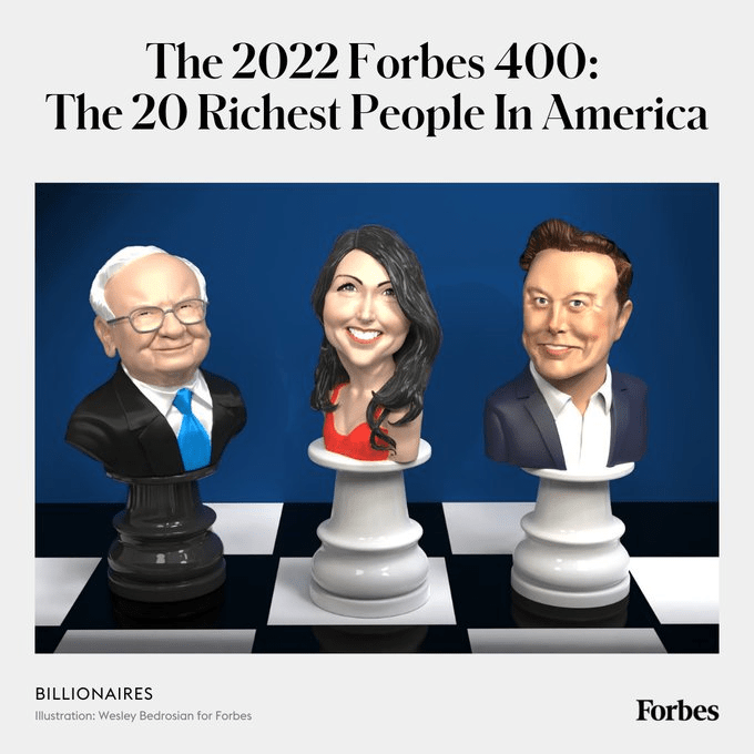 The very top are $235 billion poorer than a year ago, but they’re still worth a combined $1.6 trillion. Four of the top 20 are worth $100 billion or more, down from eight last year, but up from two in 2020 and none in 2017. #Forbes400 https://trib.al/JwqOmPc