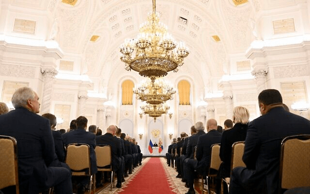 Putin’s televised speech took place at the opulent white-and-gold St. George’s Hall in the Grand Kremlin Palace and was frequently interrupted by applause from an obsequious audience of top officials and lawmakers.