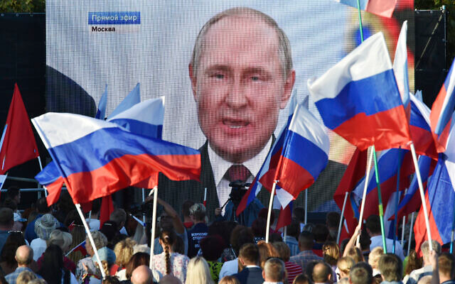 People watch on a large screen, as Russian President Vladimir Putin delivers his speech after a ceremony to sign the treaties for four regions of Ukraine to join Russia in Moscow’s Kremlin, during a meeting in Sevastopol, Crimea, Friday, Sept. 30, 2022. (AP Photo)