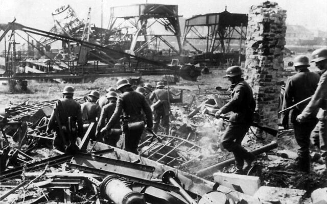 German soldiers search rubble in Westerplatte for Polish survivors in Danzig, Poland on September 2, 1939. (AP Photo)
