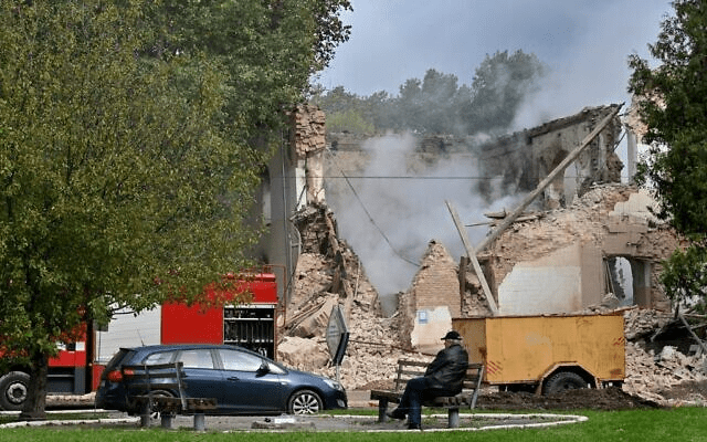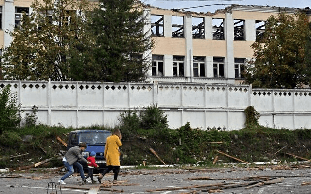 A family walks past a building destroyed by Russian, Iranian-made, drones after an airstrike on Bila Tserkva, southwest of Kyiv, on October 5, 2022, amid the Russian invasion of Ukraine (Sergei SUPINSKY / AFP)
