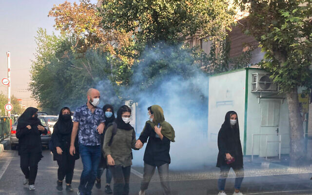 In this photo taken by an individual not employed by the Associated Press and obtained by the AP outside Iran, tear gas is fired by security to disperse protestors in front of the Tehran University, Iran, October 1, 2022. (AP Photo)
