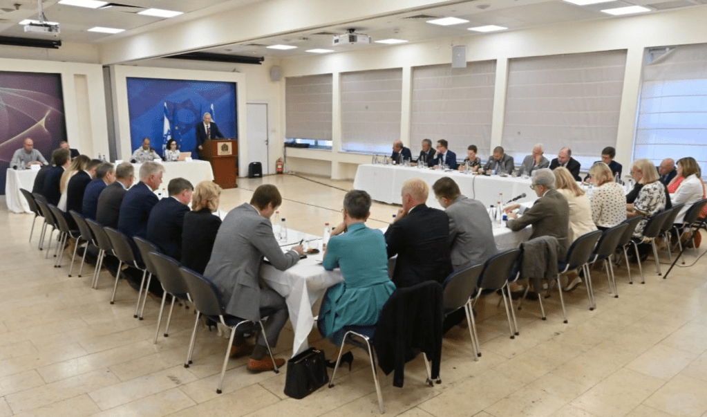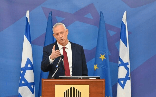 Defense Minister Benny Gantz speaks to ambassadors from EU nations on October 19, 2022 (Ariel Hermoni/Defense Ministry)