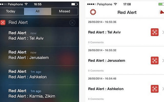 Screenshot of Red Alert, the Israeli app that warns locals of incoming missile attacks. (Courtesy)