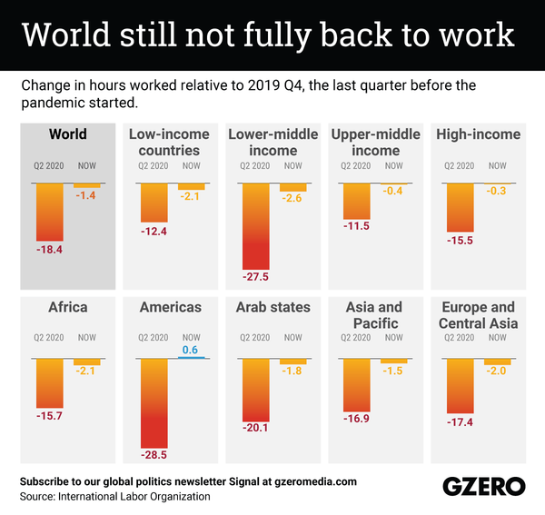 It’s been almost three years since the COVID pandemic swung a wrecking ball through our societies, our economies, and our workplaces. But even now, with the most acute phase of the crisis behind us, many aspects of life still aren’t back to what they were in the B.C. (Before Coronavirus) era. One great example is the hours worked in our economies. When the pandemic struck, lockdowns and other restrictions caused the number of hours worked on a quarterly basis around the world to plunge by nearly 20% compared to the final quarter of 2019, the baseline for “last moments of pre-pandemic normalcy.” But since then, the world as a whole still hasn’t gotten back to pre-pandemic levels of hours worked — we’re still almost 1.5% below them. Lower-income countries are struggling more than rich ones to get back to where they were, and there is only one region of the world that shows more hours worked now than before the pandemic — can you guess which one it is?