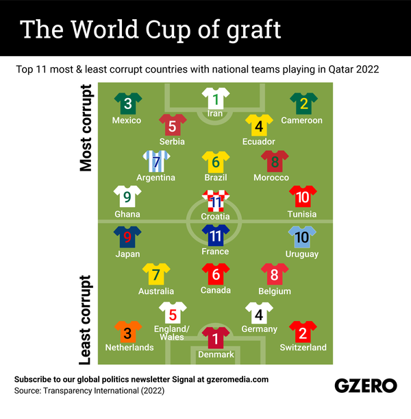 21 Nov, 2022 Uncategorized The World Cup of graft. Top 11 most and least corrupt countries with national teams playing in Qatar. Posted by Fred Bassett The Graphic Truth Share this: Click to share on X (Opens in new window) X Click to share on Facebook (Opens in new window) Facebook Click to share on LinkedIn (Opens in new window) LinkedIn Click to share on Reddit (Opens in new window) Reddit Click to email a link to a friend (Opens in new window) Email More Click to print (Opens in new window) Print Like Loading... Related