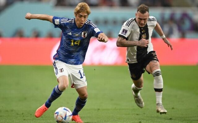 Japan’s midfielder #14 Junya Ito is challenged by Germany’s defender #03 David Raum during the Qatar 2022 World Cup Group E football match between Germany and Japan at the Khalifa International Stadium in Doha on November 23, 2022. (Philip FONG/AFP)
