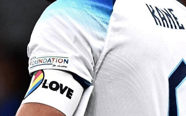 Illustrative: England’s forward Harry Kane wearing a rainbow armband. reacts after losing the UEFA Nations League’s League A Group 3 match between Italy and England, at the San Siro Stadium in Milan, September 24, 2022. (Marco BERTORELLO/AFP)
