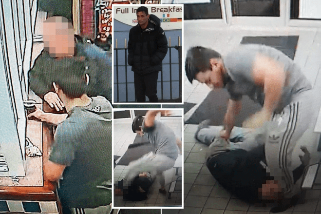 Sickening moment ‘extremely violent’ thug launches horror attack on innocent man inside popular chip shop