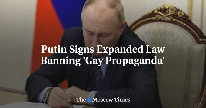 themoscowtimes.com Putin Signs Expanded Law Banning ‘Gay Propaganda’ Russian President Vladimir Putin signed a law expanding the existing ban on the prohibition of “LGBT propaganda” to children to include the