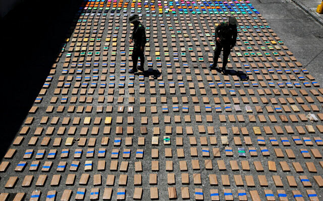 In this Thursday, Aug. 10, 2017 file photo, police officers walk among packages of seized cocaine at the Pacific port of Buenaventura, Colombia, after about one ton of cocaine was seized in a container during an operation by counternarcotics police at the port. (AP/Fernando Vergara)