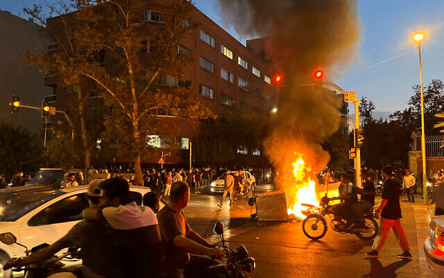 In this photo taken by an individual not employed by the Associated Press and obtained by the AP outside Iran, a police motorcycle and a trash bin are burning during a protest over the death of Mahsa Amini, a 22-year-old woman who had been detained by the nation’s morality police on September 19, 2022, in downtown Tehran, Iran. (AP)