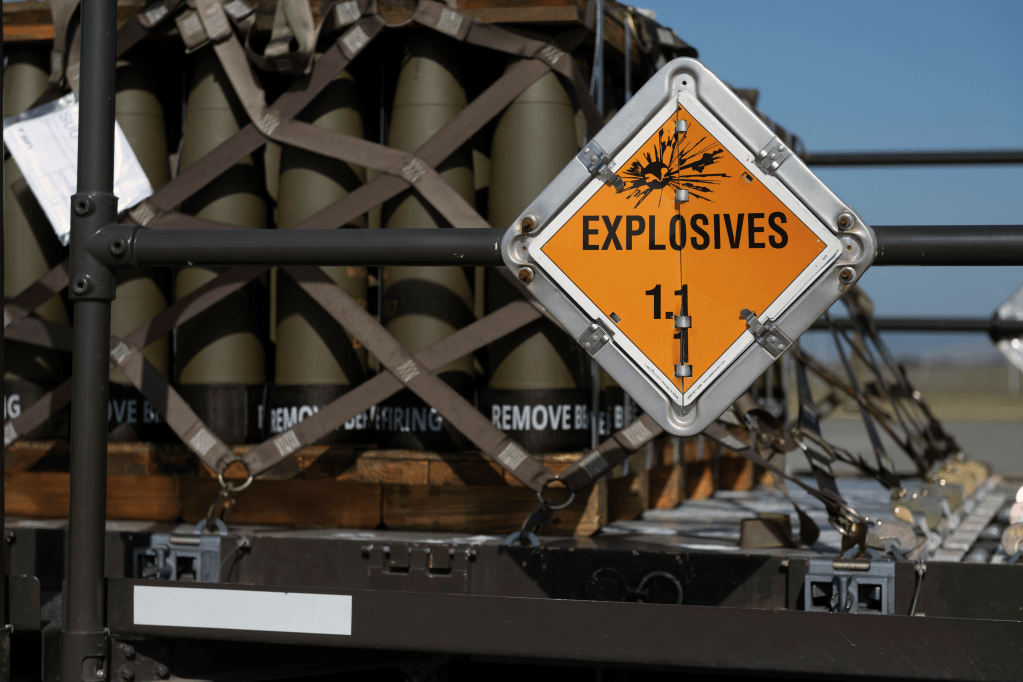 Pallets holding munitions are transported off an aircraft cargo loader into a Boeing 747 at Travis Air Force Base, California, April 26, 2022. US Air Force Photo