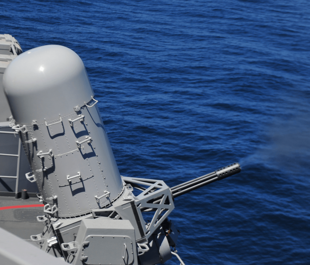 A MK 15 Phalanx close-in weapons system (CIWS) is test fired on the flight deck aboard the aircraft carrier USS Carl Vinson (CVN-70). US Navy Photo